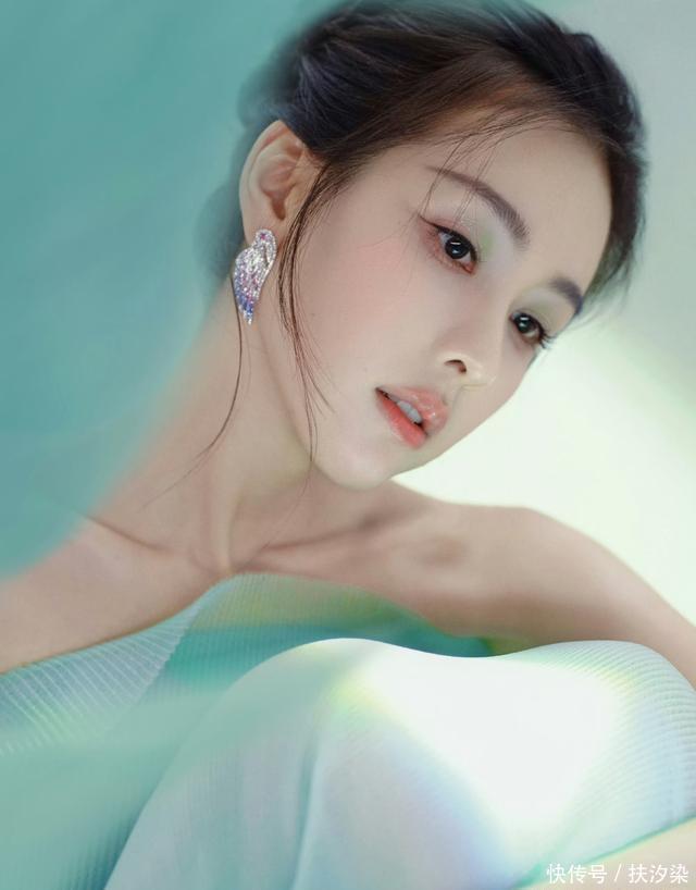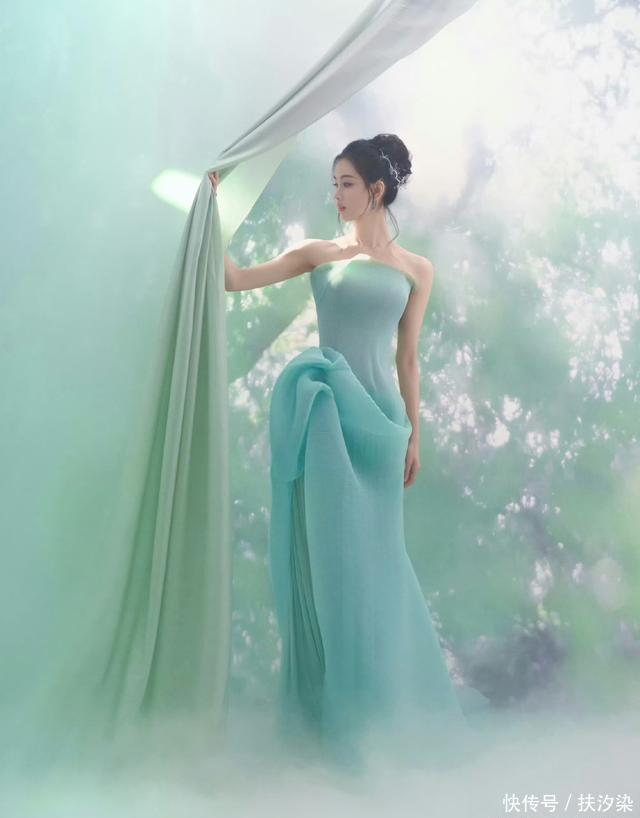 陈都灵 薄荷绿色薄纱长裙采用层叠缠绕与垂坠飘逸设计。